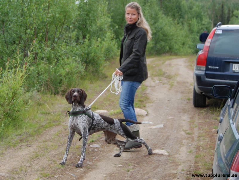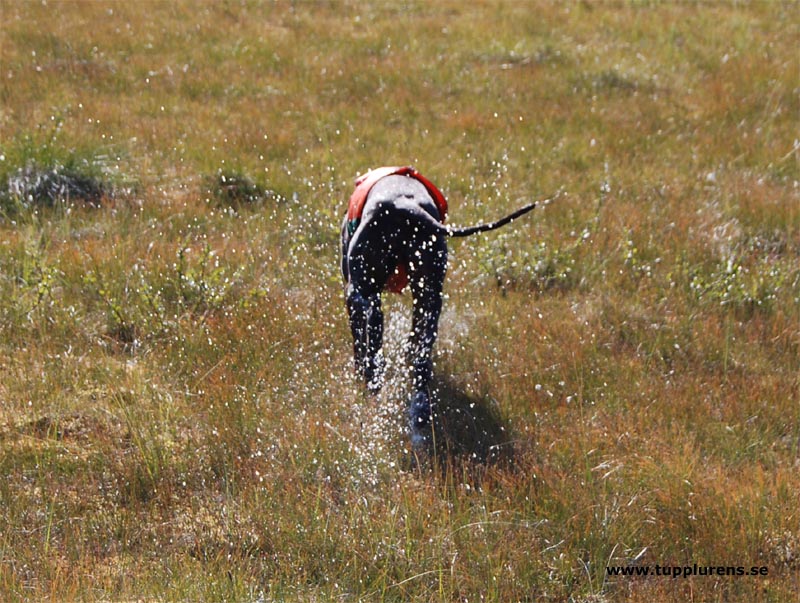 | 080803. Det särskilda provet hemma i Arvidsjaur var väl arrangerat och trevligt. 8 hundar kom till start och representerade de tre olika klasserna. Ingen sommarvärme ute utan bara +13 grader och några stänk av regn. Spåret var det som hon fixade bäst men vattnet var också ok. Räka var nog ganska avundsjuk där i bakluckan. Bara lillasystern som fick jobba idag. Spectra värmde upp med strechövningar inför spåret (bild1) för hon räknade kanske med att möta stora havstrutar. Glad efter spåret (bild 2) och med tungan mitt i munnen rusar hon mot mer belöning. |