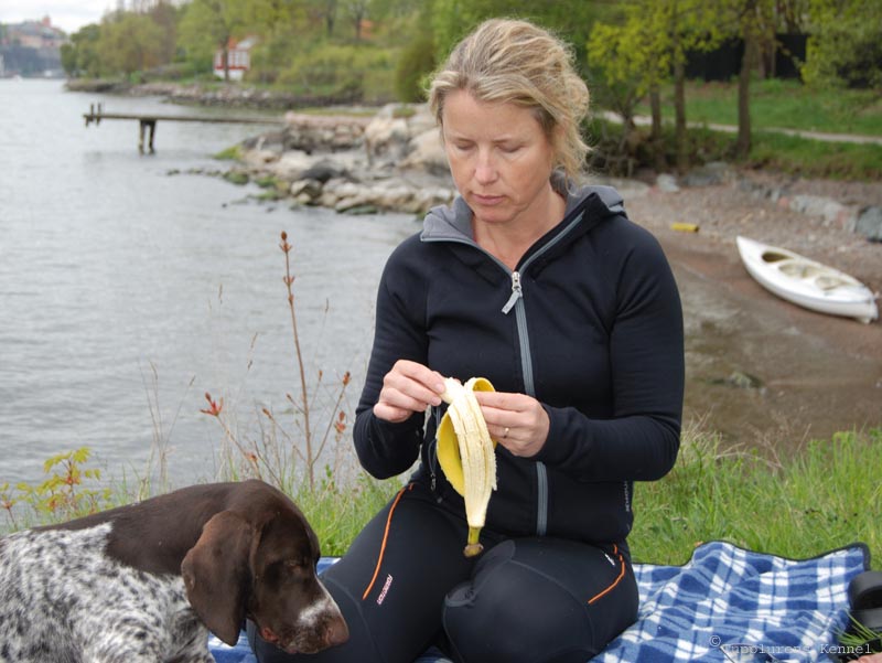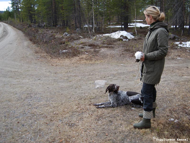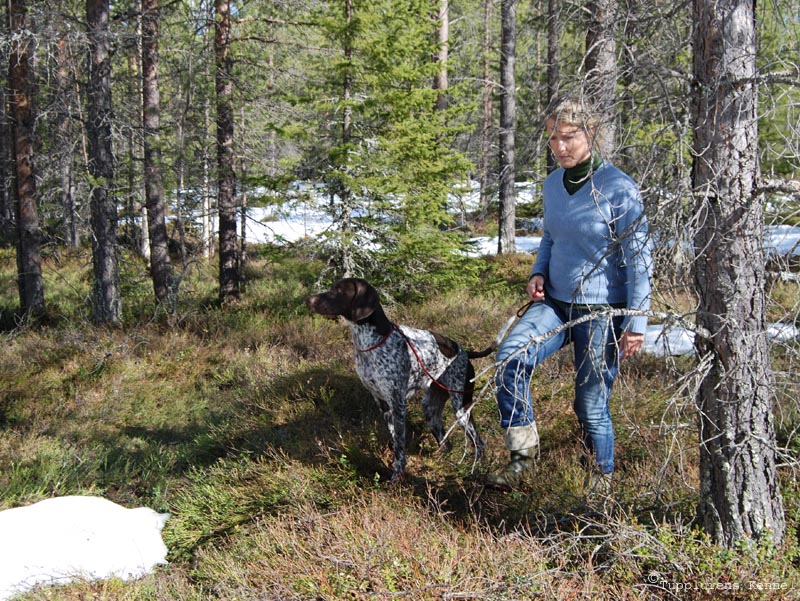 080521. Eftersöksträningen i full gång. Spår på barmarken mellan snöfläckarna. Hon gillar det verkligen, Räka. |